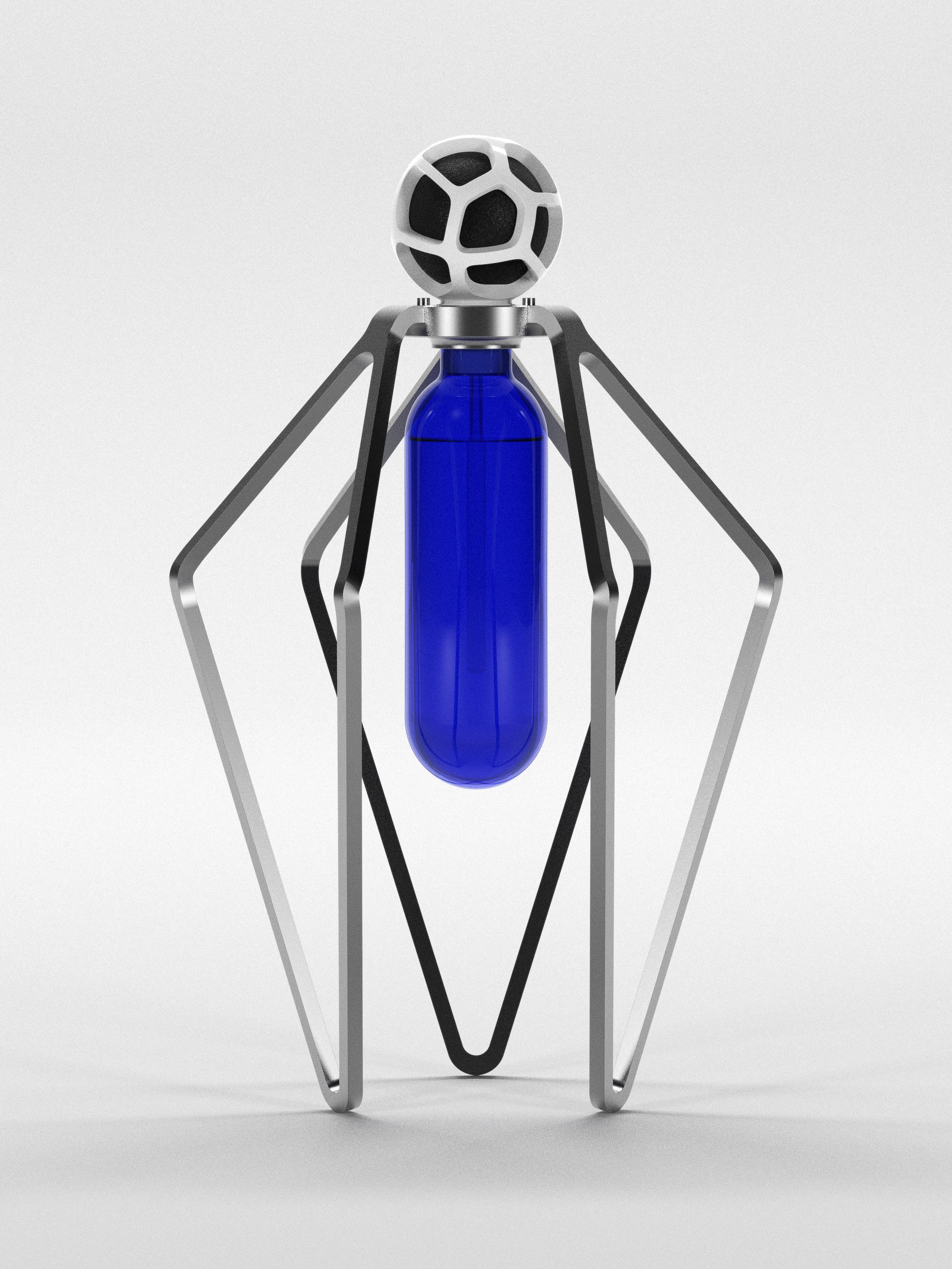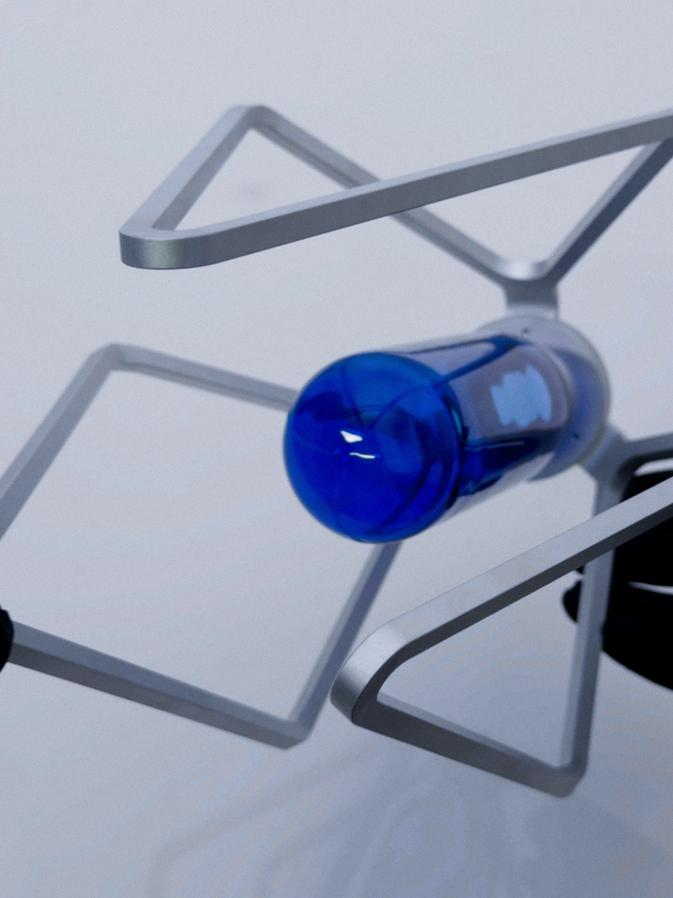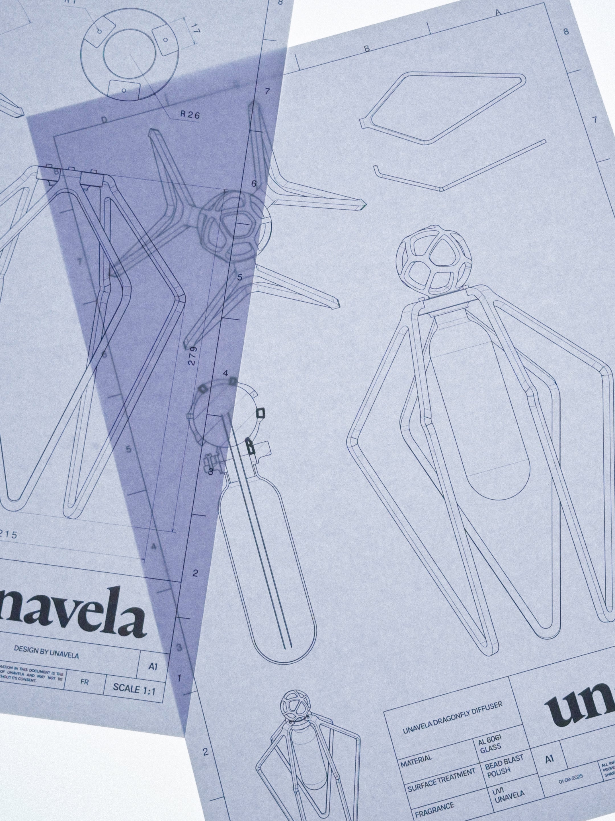 Dragonfly Fragrance Diffuser, inspired by the delicate balance of a dragonfly’s form. A familiar object, reimagined without reeds and rebuilt around a new diffusion system. A borosilicate glass vessel in deep tinted blue holds the fragrance, drawn upward through a capillary tube and released through a reticular sponge that diffuses it gently into the air. Three aluminium 6061 pods, CNC cut and precisely bent, support the structure, while a reinforced ABS head completes the assembly. This fragrance diffuser is more than a functional object. It’s our way of rethinking the everyday. Made to be used, noticed, and kept. Not just a diffuser, but a quiet conversation about design. This is the third edition in a series of functional objects by UNAVELA.