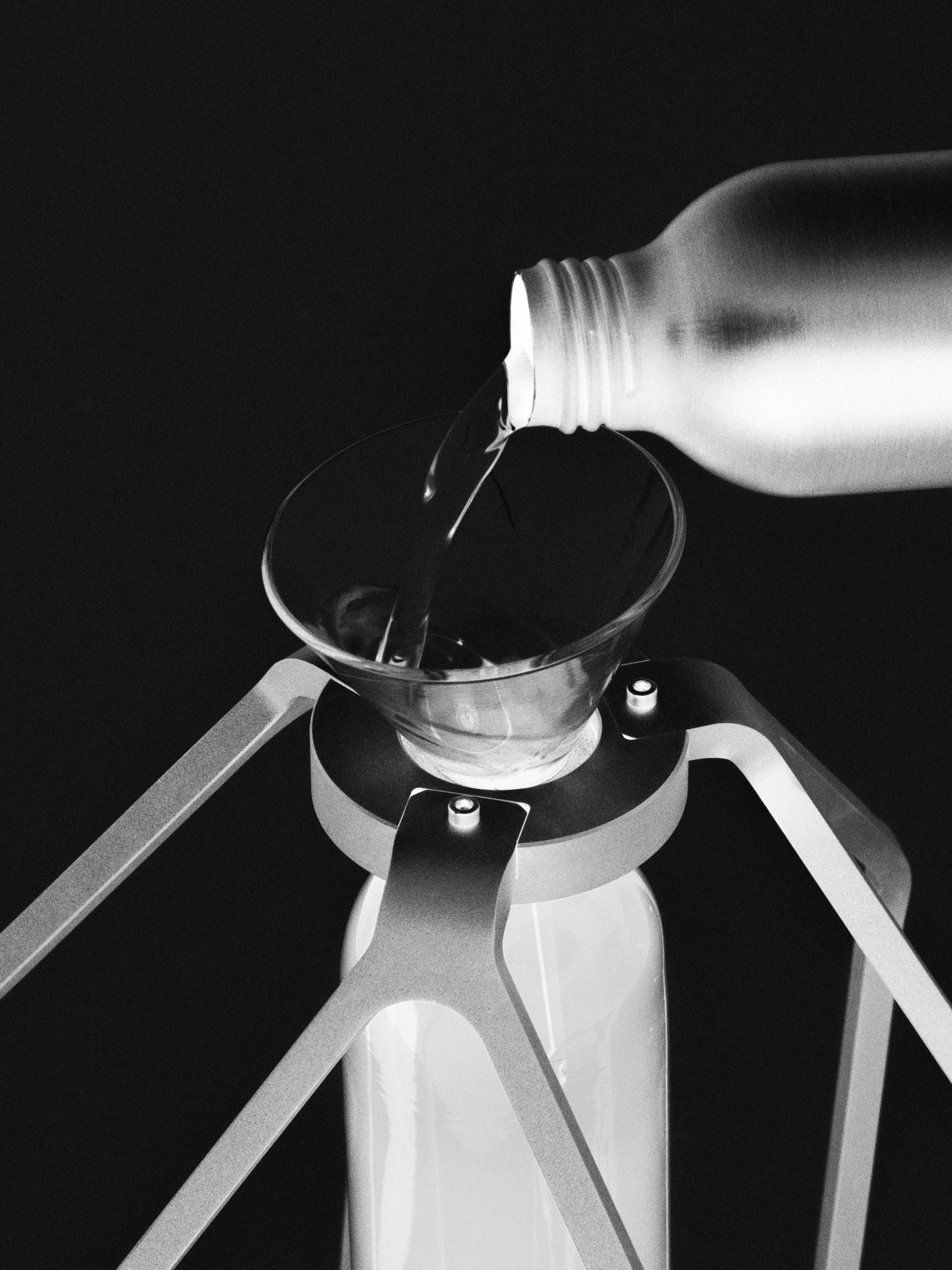 Every element of the Dragonfly diffuser has been developed under our full direction, from early technical sketches to final assembly. Each aluminium pod is CNC-cut from 6061 aluminium, then precisely bent, bead-blasted and anodised for a clean, satin finish. The central container is made from borosilicate glass, mouth-blown by hand and tinted in the mass for lasting colour. The head is 3D printed in reinforced ABS and fitted with a custom reticular sponge. All components are manually assembled and adjusted in our atelier in the south of France.